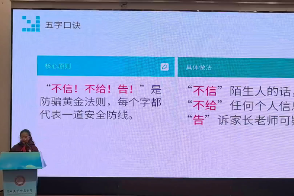 常大附小五六年级开展防诈骗主题教育 为增强学生的防诈骗意识,提高自我保护能力,附小五、六年级近日开展了以“擦亮双眼,远离骗局”为主题的防诈骗教育活动。 活动形式丰富多样,六7班带来的法治情景剧《屏幕后的黑手》以生动的表演,直观展现了游戏诈骗的常见套路;模拟法庭环节围绕《网络游戏诈骗案》展开审理,让学生沉浸式感受法律对诈骗行为的惩处;防诈骗宣讲环节中,学生代表张谷睿结合案例分享防骗技巧,强调“不轻信、不透露、不转账”的防骗原则。 此次活动通过情景演绎、模拟实践与知识讲解相结合的方式,让五、六年级全体师生深入认识诈骗陷阱,掌握实用的防骗方法,为筑牢校园安全防线打下了坚实基础。 (常大附小供稿 撰稿:陈晨 摄影:陆俊杰 审核:庄荷娟)